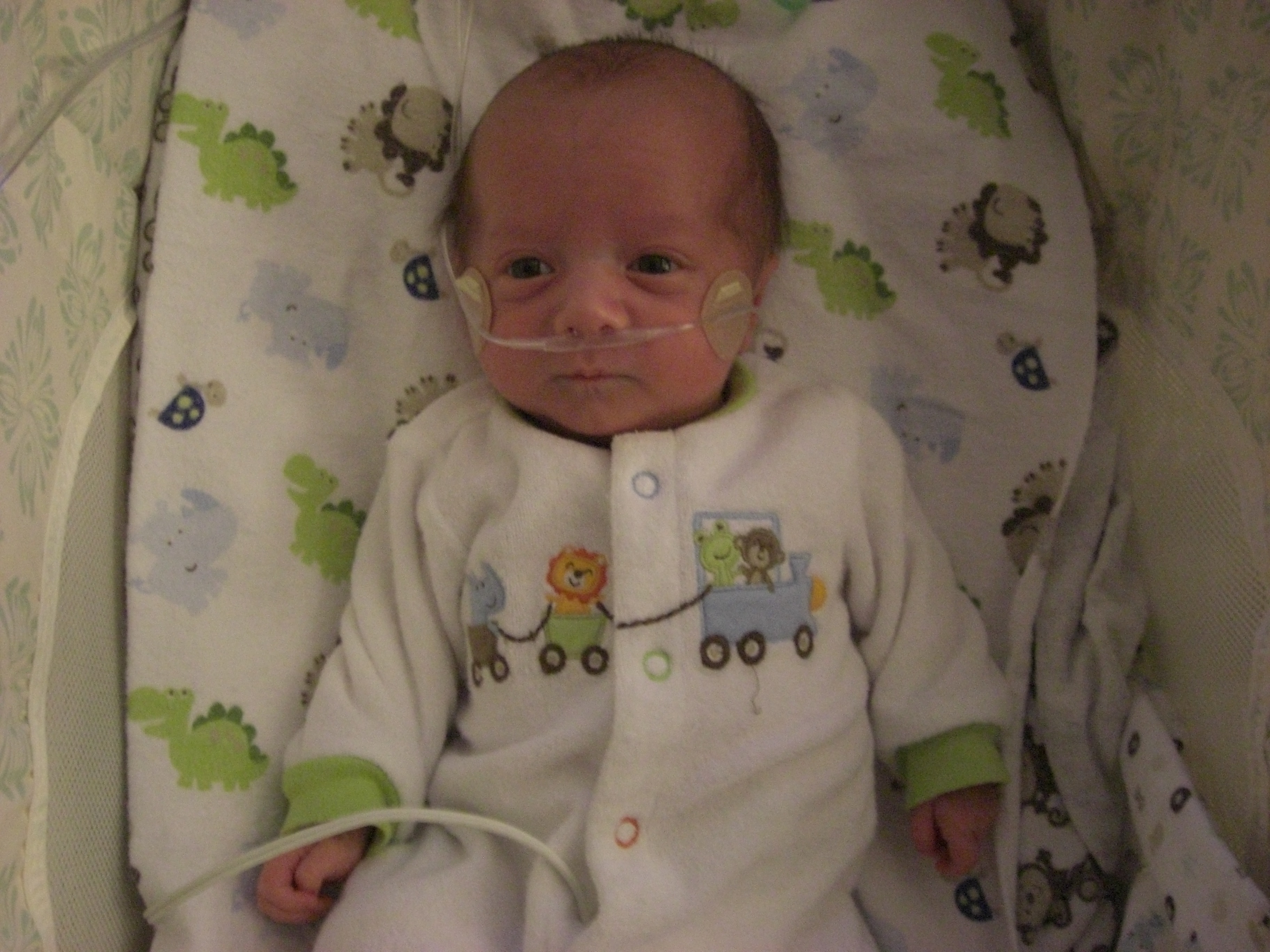 Max came home on oxygen and required continuous oximetry monitoring to make sure his oxygen saturation was adequate, and so we could monitor him for episodes of apnea. Needless to say, Max often had tubes and wires everywhere. The pulse ox made it difficult for him to wear any footie pajamas, so we had to feed the wire up through the space between the gaps. Needless to say, he didn’t have many pairs of footie pajamas, and, out of habit, still doesn’t today.