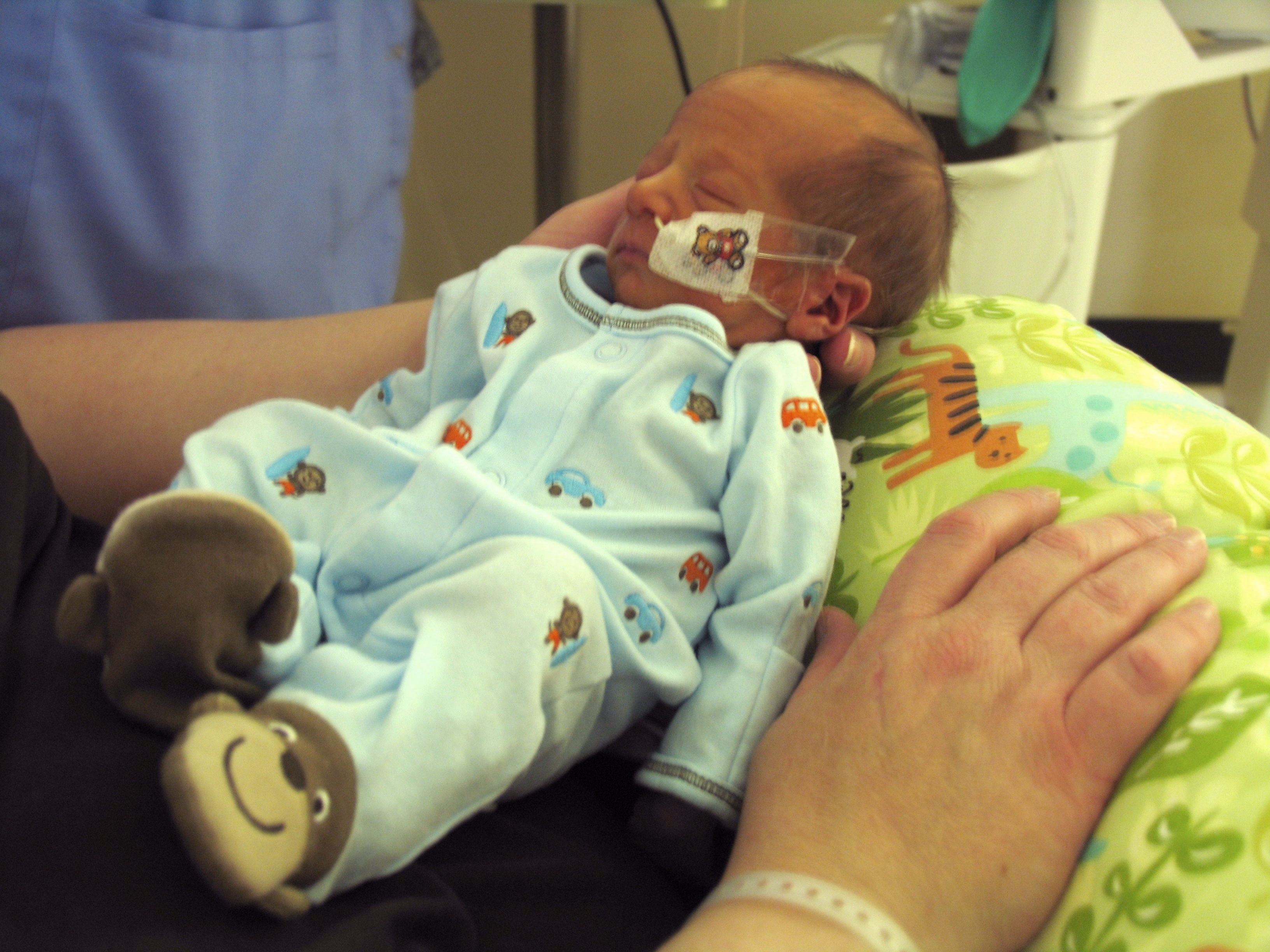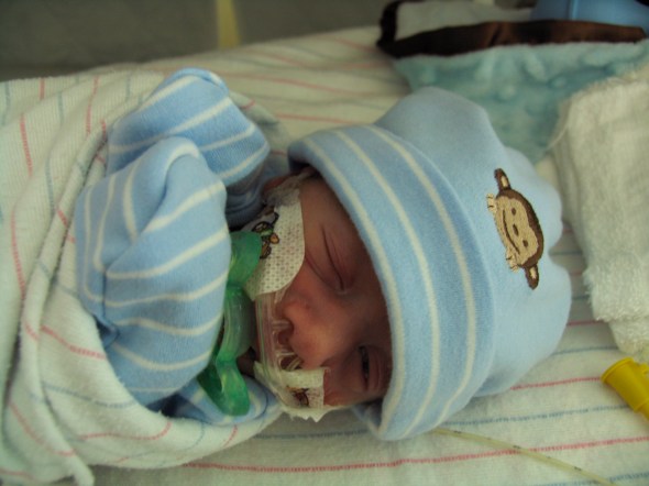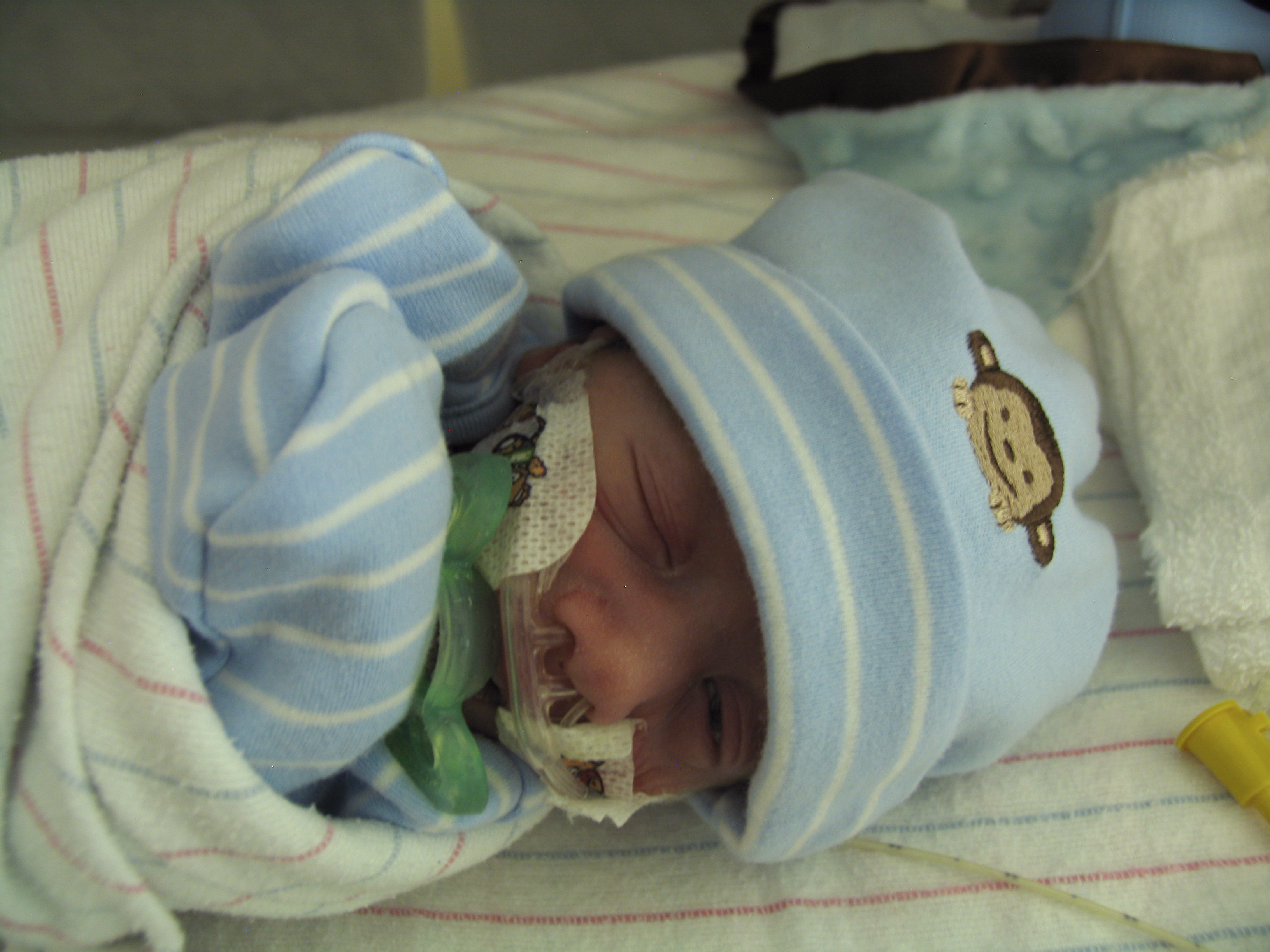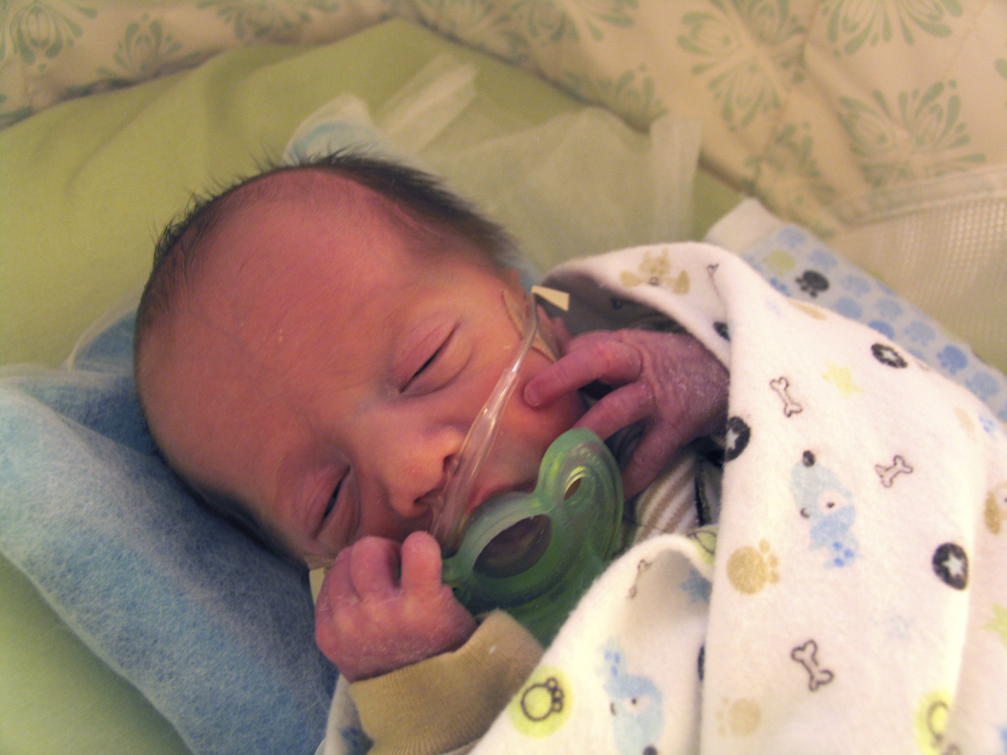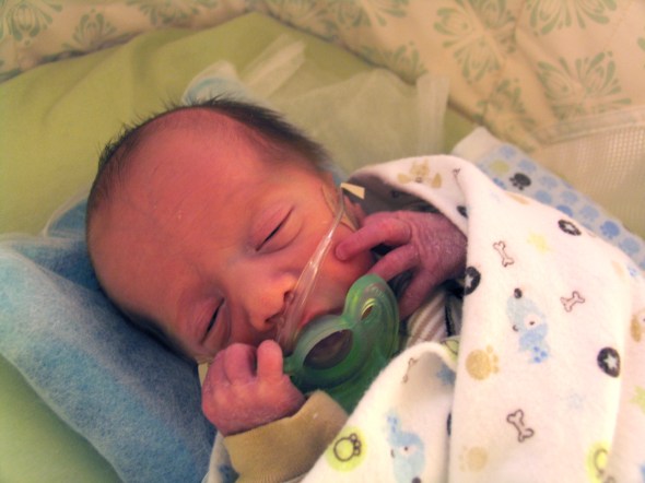 Max’s NICU stay was a roller coaster – a small roller coaster, but one nonetheless. At birth, he was on oxygen, then laer that afternoon off, but couldn’t maintain his oxygen saturation, so back on, then off after a few days. At the time of this picture, he was off, but then went on to develop apnea of prematurity, and was placed back on the oxygen and started on daily caffeine.