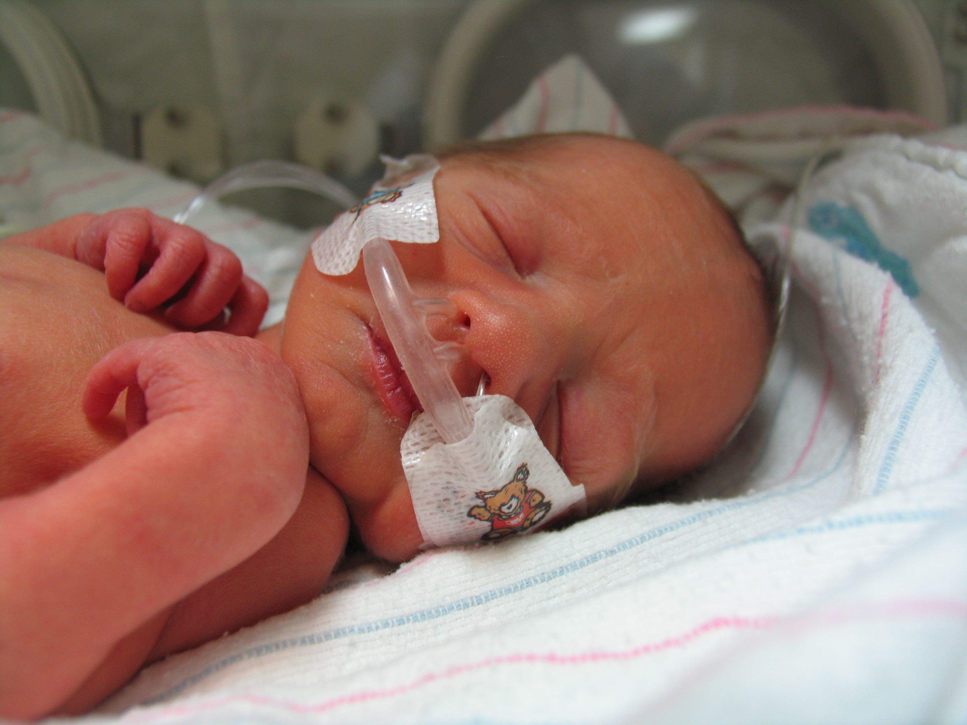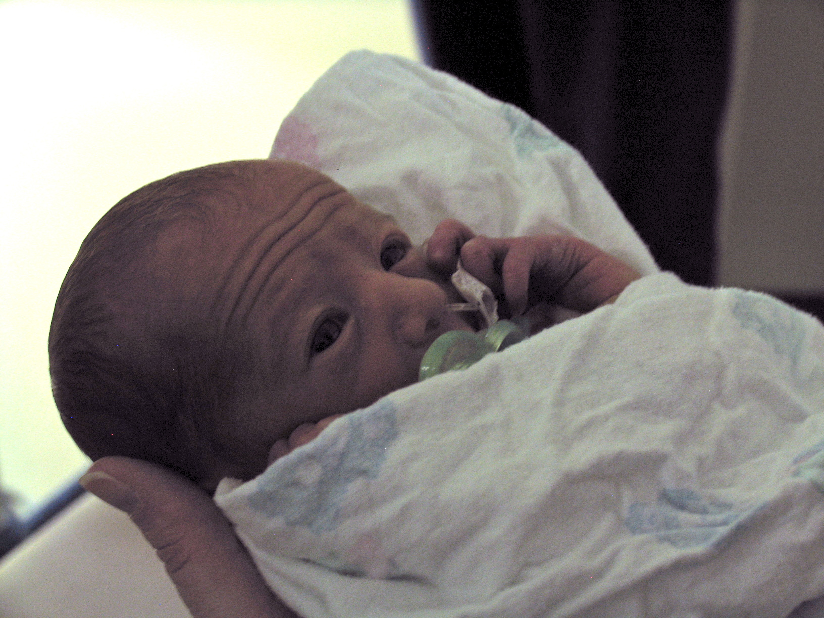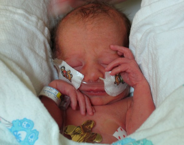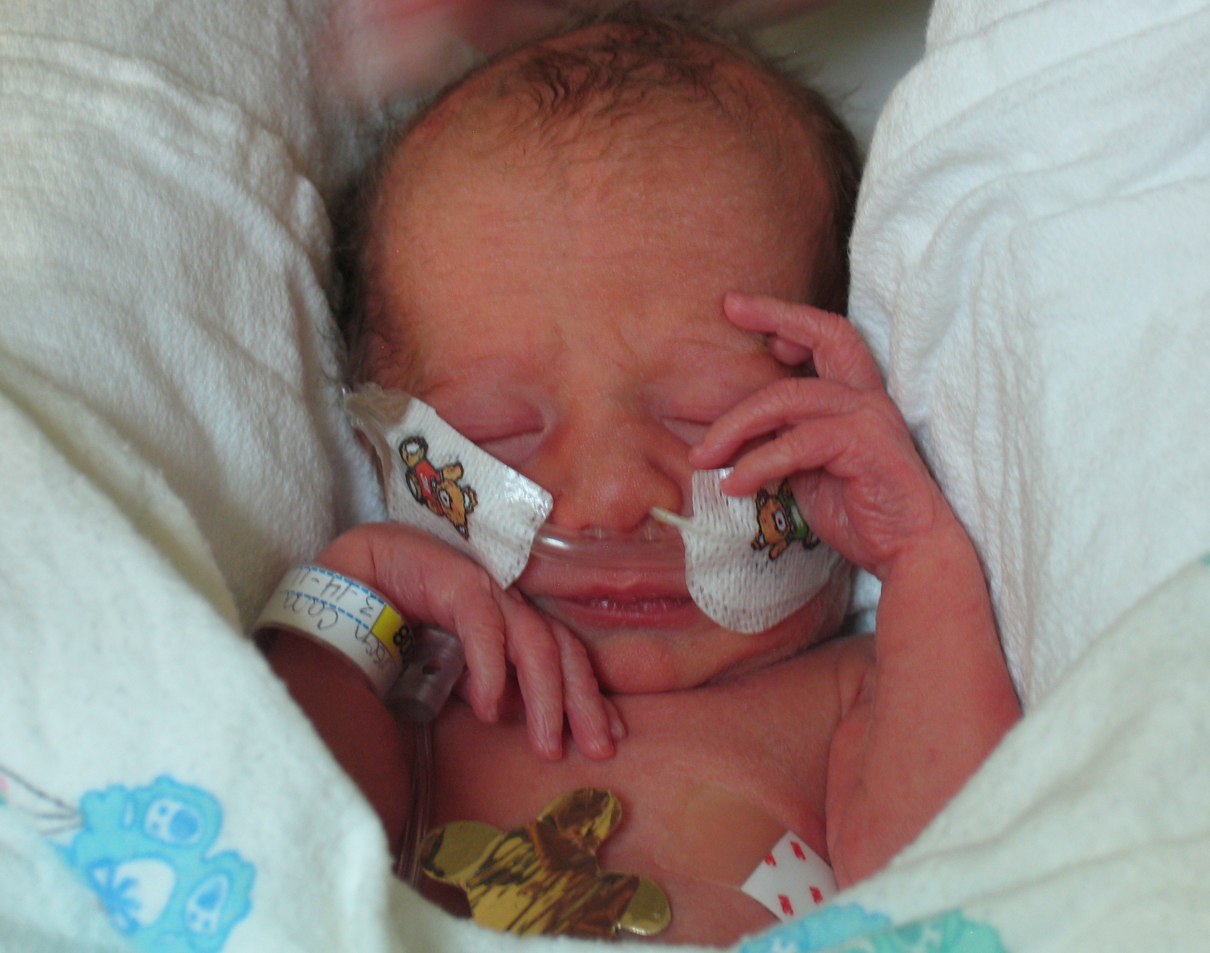 Max’s NICU stay was a roller coaster – a small roller coaster, but one nonetheless. At birth, he was on oxygen, then laer that afternoon off, but couldn’t maintain his oxygen saturation, so back on, then off after a few days. At the time of this picture, he was off, but then went on to develop apnea of prematurity, and was placed back on the oxygen and started on daily caffeine.