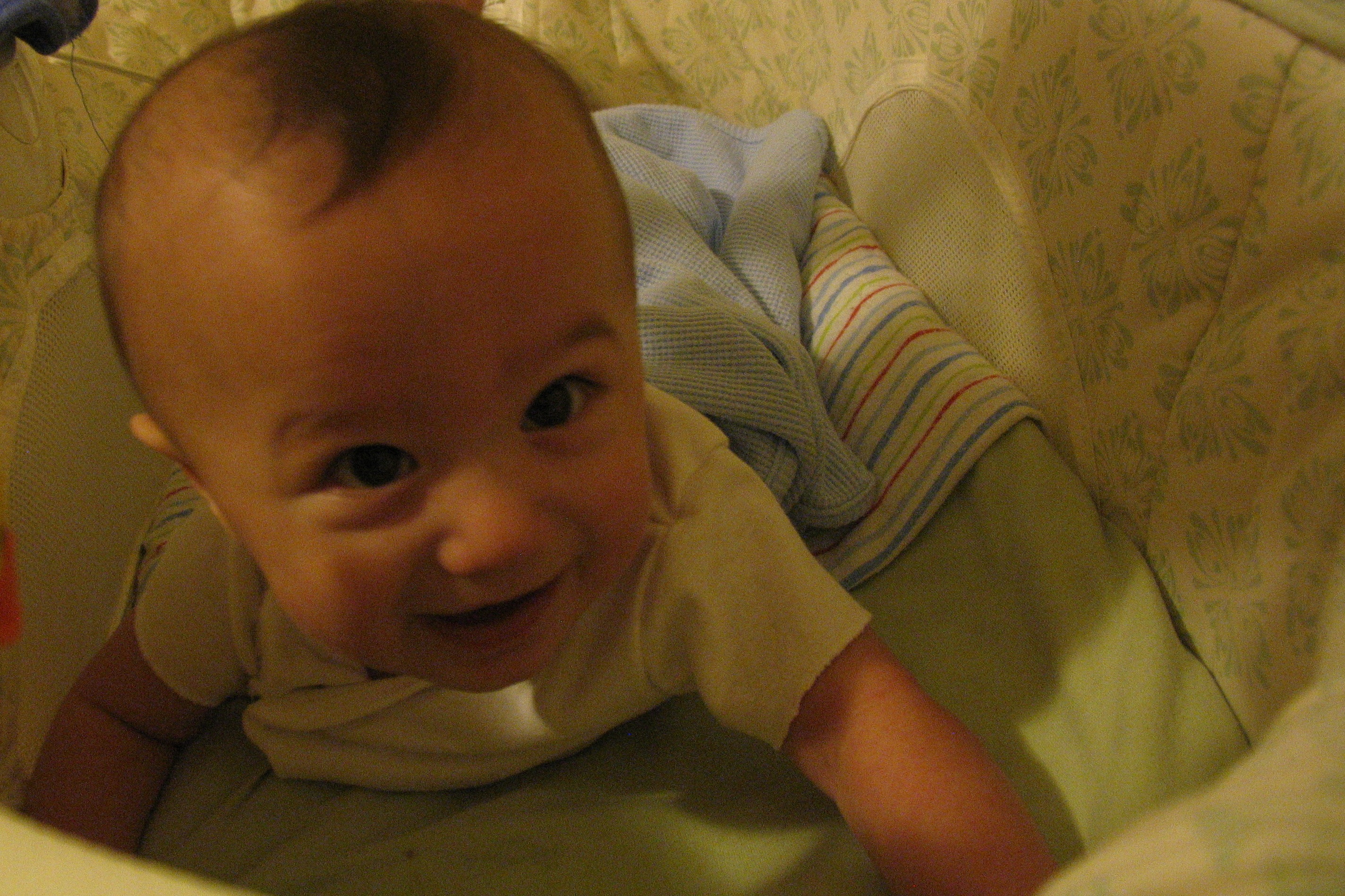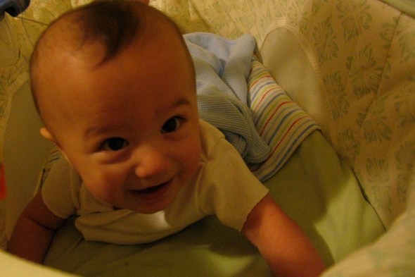 Recently, Max has decided that the “Back to Sleep” program no longer applies to him. It does not matter how we place him in the bassinet, he immediately flips on to his left side, and overnight, he works his way to belly sleeping. When he does wake up in the morning, he’s amazingly cheerful. Quite a feat for the child who absolutely hated Tummy Time in the beginning.