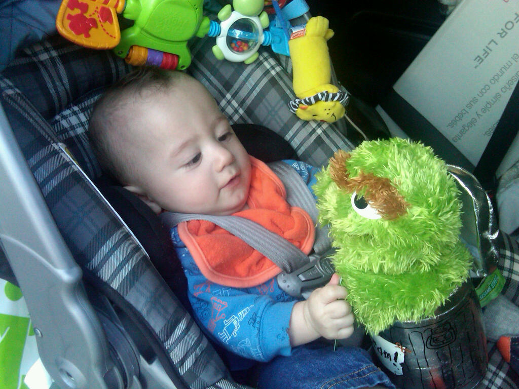 Too Max to a local children’s store and was showing him all the different Sesame Street characters. He showed complete disinterest towards Big Bird, Snuffalupagus, Grover, and Cookie Monster. However, he saw Oscar, grabbed him, and refused to let go. He squeals at Oscar, he chews on Oscar, he falls asleep with Oscar in his arms. Only my kid would want to be BFFs with the snarky green monster that dwells in a garbage can.