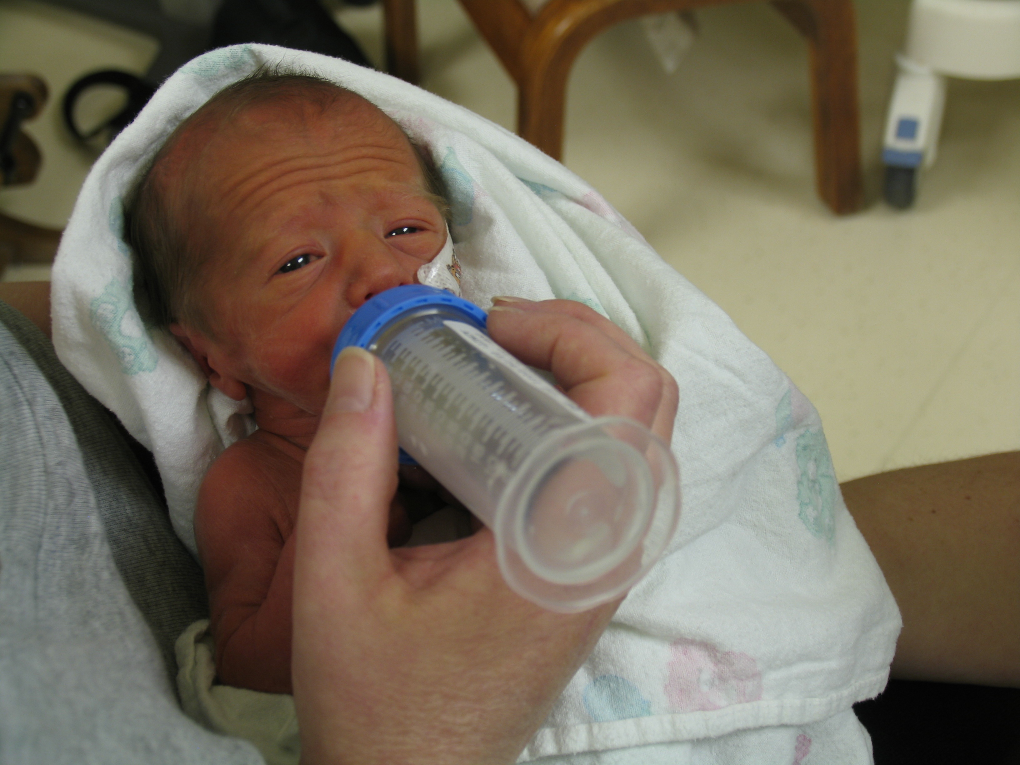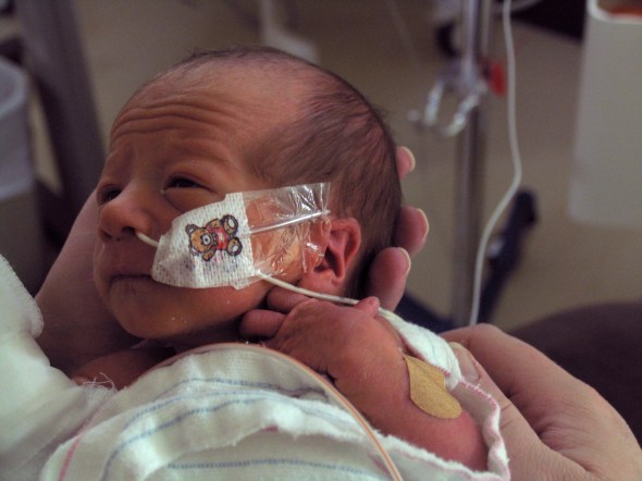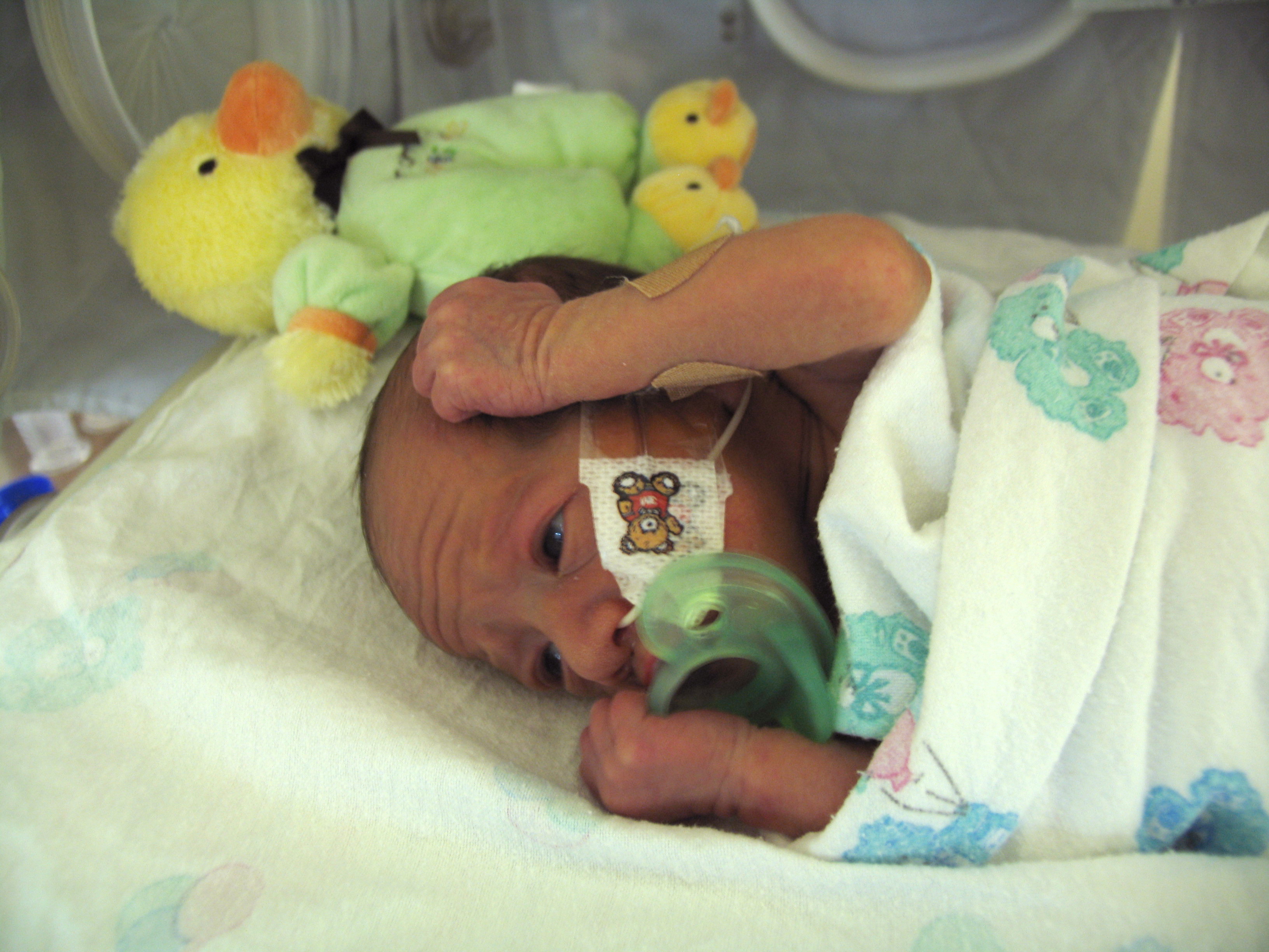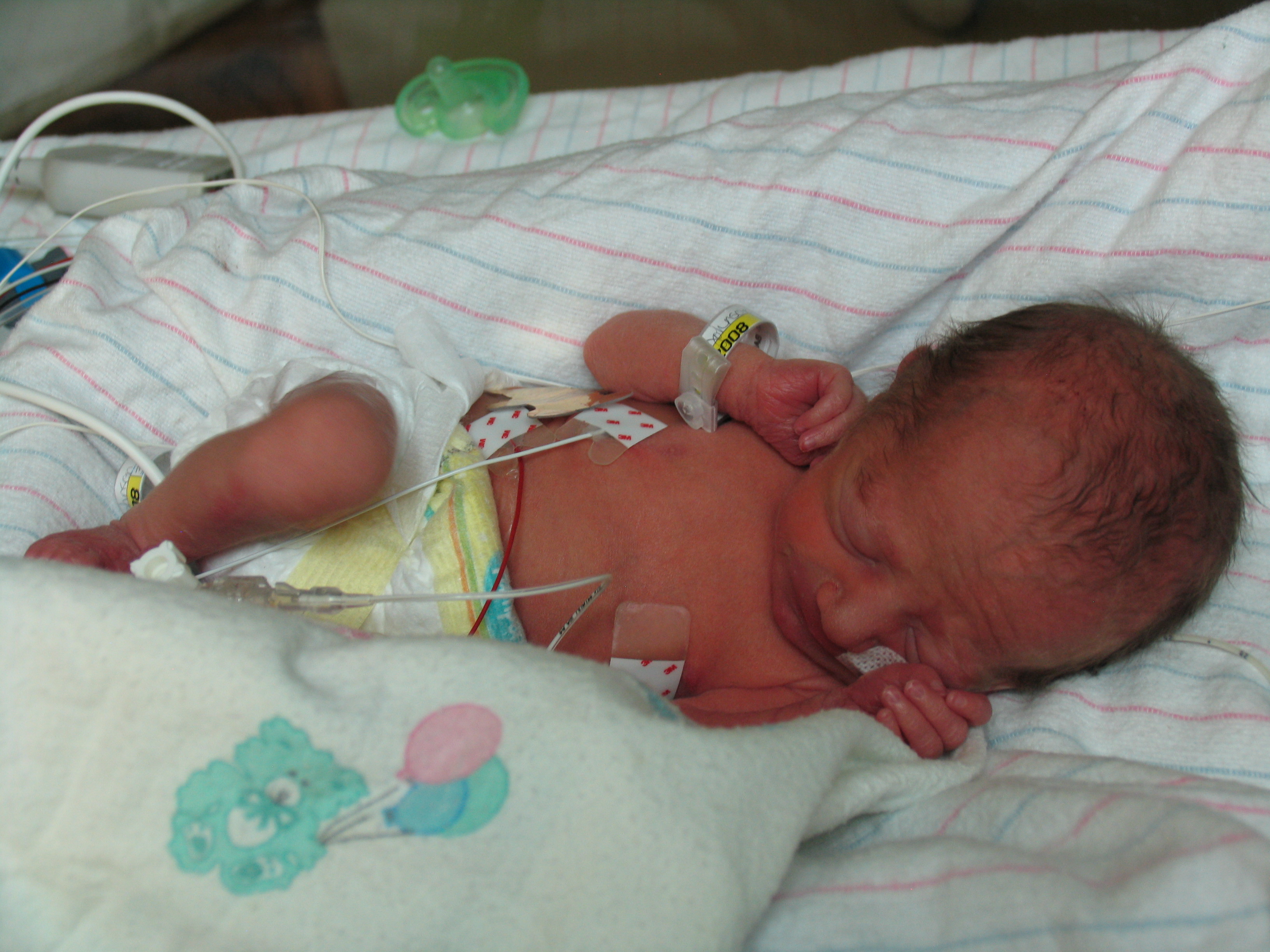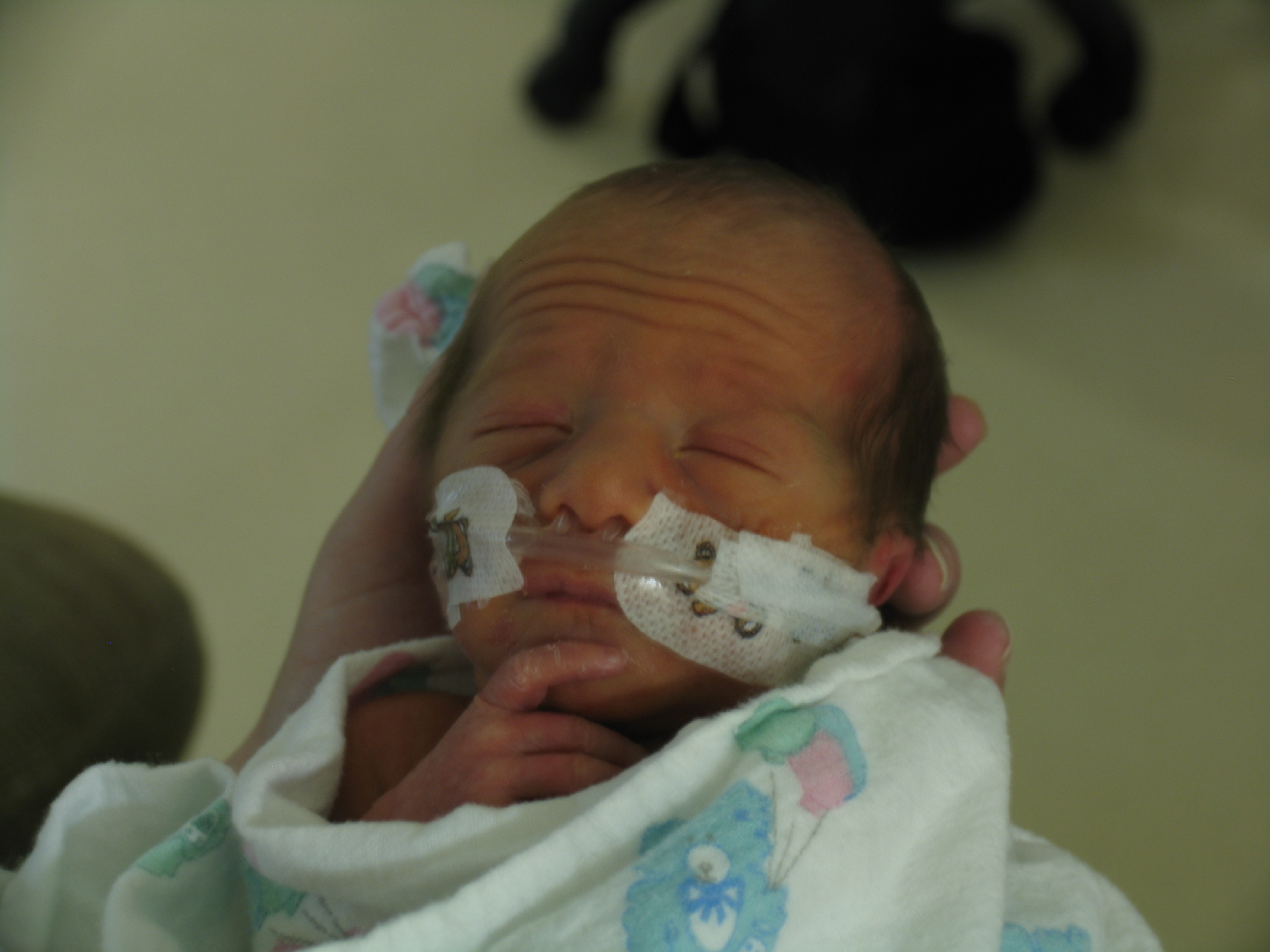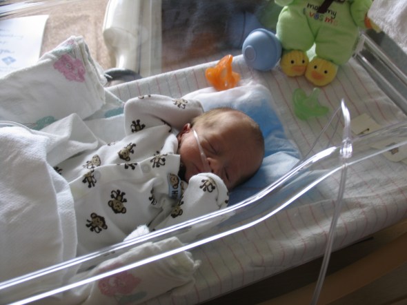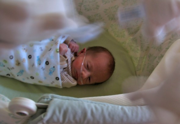 Max’s NICU stay was a roller coaster – a small roller coaster, but one nonetheless. At birth, he was on oxygen, then laer that afternoon off, but couldn’t maintain his oxygen saturation, so back on, then off after a few days. At the time of this picture, he was off, but then went on to develop apnea of prematurity, and was placed back on the oxygen and started on daily caffeine.