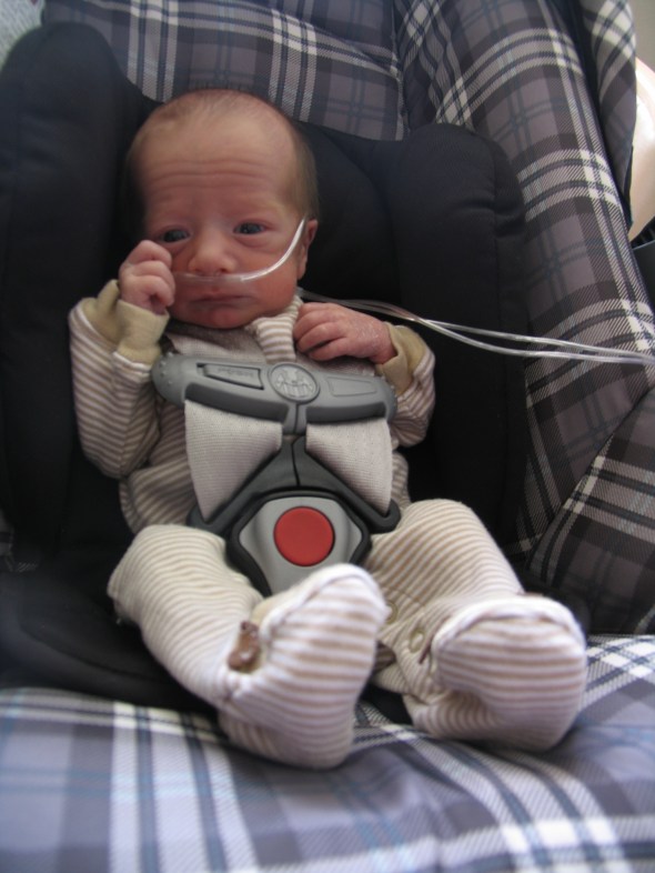 Max came home on oxygen and required continuous oximetry monitoring to make sure his oxygen saturation was adequate, and so we could monitor him for episodes of apnea. Needless to say, Max often had tubes and wires everywhere. The pulse ox made it difficult for him to wear any footie pajamas, so we had to feed the wire up through the space between the gaps. Needless to say, he didn’t have many pairs of footie pajamas, and, out of habit, still doesn’t today.