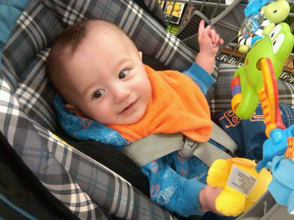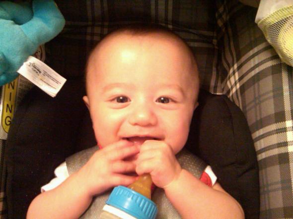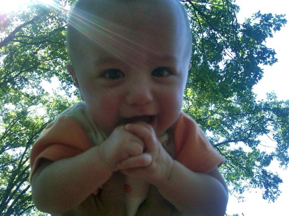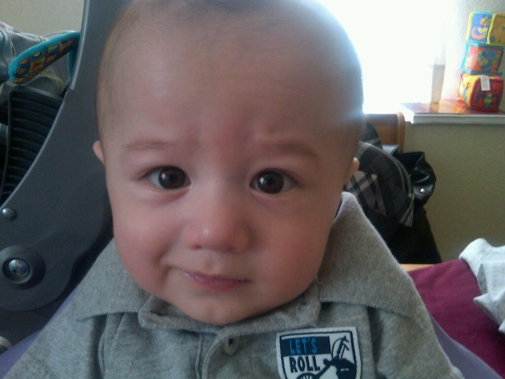 It’s getting difficult to get a picture of him with my Blackberry – he sees me aiming it at him, the smiles disappear and he gets the “grumple” look. However, sometimes I am a sneaky ninja, and can catch him with a grin.
